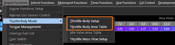 Settings are adjusted from the Engine Functions -> Throttle Body Model menu. Throttle body templates are also available to load into the ECU from the File -> Import Module File menu