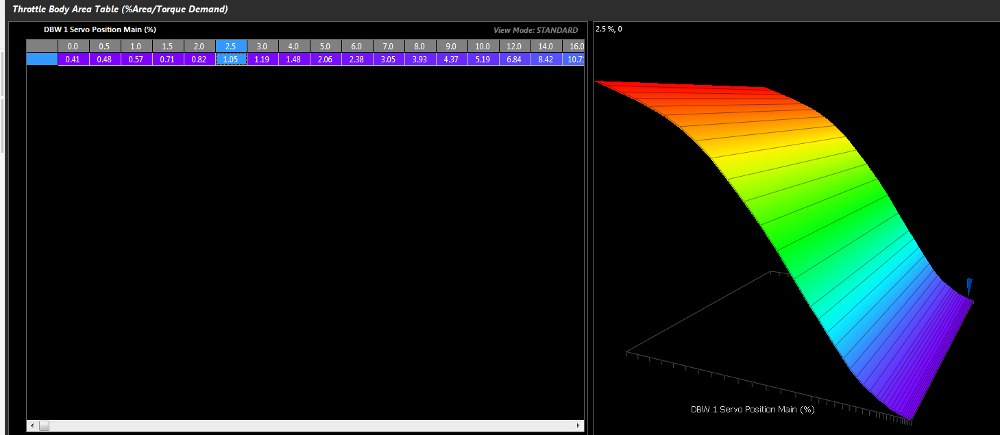 Using the table in the below image, the ECU would find the 4.37% area and correlate this to 9.0% Servo Position. The DBW Servo Position Target therefore becomes 9.0%